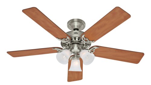 Hunter combines 19th century craftsmanship with 21st century design and technology to create the Architect Series of fans. Fans of unmatched quality, style, and whisper-quiet performance. The Architect Series Plus incorporates less ornate lines than traditional designs, without being severely basic, for a true -Inch updated classic-Inch look. Designer New Bronze finish blends seamlessly with your decor. Reversible Walnut/Cherry blades let you customize your blade finish to furniture or wood molding. Three light fixture features clear scalloped glass shades, uses 3 60W candelabra bulbs not included. Whisper Wind quiet motor delivers the cooling power you want, without the noise you don't. Installer's Choice 3-position mounting system lets you mount your fan flush for more clearance, on a standard down rod, or using an extension down rod and angled mounting for steeply pitched ceilings. Hands Free Canopy designed to accommodate sloped ceilings and EZ hang mounting help make installation simple and safe. Designed for large rooms up to 400 square feet (37.1612 square meters), Hunter's 49-Inch to 60-Inch ceiling fans have airflow efficiencies ranging from approximately 51 to 176 cubic feet per minute per watt at high speed. Using your Hunter fan properly throughout the year can help to significantly decrease personal energy use without sacrificing comfort. A properly used fan can help to reduce summer cooling costs by up to 47-Percent* Limited lifetime warranty on fan motor only. 1 year limited warranty on other parts, excluding glass globes or light bulbs. *(On average at low speed setting. Savings may differ depending upon geographic location, housing charactersitics and cost of energy.)