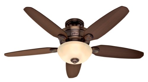 I purchased this Hunter ceiling fan for the master bedroom in my new home. I really like the look of the brown/bronze sections of this ceiling fan. Once it was installed, I really liked it even more --- it just looks fantastic. The installer did encounter a problem with the regular down rod --- it seemed to have a defect in the grooves that prevented it from being able to be connected with the canopy. As a result, it had to be installed with the low profile or flush mounting. The light bowl is a muted brown color and produces more than sufficient light without the glare of some other colored light bowls. If you want a very elegant-looking ceiling fan for your home, I think that this one may be your answer.