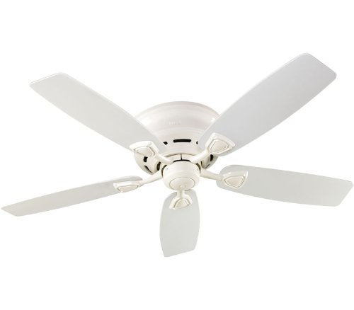 I ordered this fan for my kitchen, which has 8-foot ceilings. It fits snug against the ceiling, yet still cools well. This fan is solid white all over, so it blends into the white ceiling and you hardly notice it. The blades are glossy and easy to wipe clean. It is very quiet when running. I am very pleased with it.