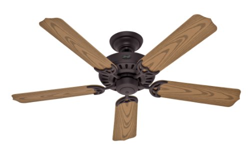 The Bridgeport Outdoor can turn a back porch into a breezeway with the flip of a switch. ETL damp listed for outdoor use in covered porches, patios, and sunrooms, this traditional fan has a relaxed, comfortable style. New Bronze designer finish and oak plastic blades resist the elements. Three speeds let you set your breeze to suit your weather. Installer's Choice 3-position mounting system lets you mount your fan flush for more clearance, on a standard down rod, or using an extension down rod and angled mounting for steeply pitched ceilings. Hunter's patented Anti-vibration Technology features a triangular hanging ball system that reduces torque for maximum stability. High performance motor delivers ultra-powerful air movement with quiet performance. Designed for large areas, Hunter's 49-Inch to 60-Inch ceiling fans have airflow efficiencies ranging from approximately 51 to 176 cubic feet per minute per watt at high speed. 3-Inch down rod included. Limited lifetime warranty on fan motor only. 1 year limited warranty on other parts, excluding glass globes or light bulbs.