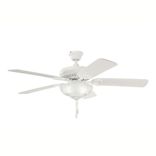 Clean white makes a divine decorating statement. From its body to the blades the Kichler Sutter Place Select 52-inch Indoor Ceiling Fan in Satin Natural White is drenched in crisp white. It has a traditional design and five fan blades perfectly pitched to move some serious air. This ceiling fan comes complete with a light kit and white alabaster glass shade to soften light from the three bulbs (included). The fan and light are both operated by pull chains: the fan has three speeds to adjust the air circulation and the light turns on and off with a simple pull of the chain. Brilliant!UL CSA listed for dry, indoor use onlyMotor: 153mm x 15mmBlade Pitch: 12 degreesIncludes 4-inch downrodLight kit includes matching glass shadeKichler QualitySince 1938, Cleveland-based Kichler Lighting has been known for their innovative designs and excellent craftsmanship. Kichler is the worlds leading decorative lighting fixture company and the winner of four ARTS Lighting Manufacturer of the Year awards. Kichler designers travel the world to discover the latest trends in exterior and interior style, colors, and designs. They then translate the best of those trends into fixtures that will bring beauty, pleasure, and light into your home. Kichler fixtures stand the test of time and are functional works of art that youre sure to treasure.Warranty and Limitations.Aside from the exceptions noted below, seller warrants the products it provides will be free from defects in material and workmanship for 1 (one) year following the date of shipment. The exceptions are:The exterior finish on LifeBrite outdoor lanterns, which have lifetime warranties for as long as the original purchaser owns it.Energy Star products have a two-year warranty.There are no warranties on light bulbs.There are no warranties on the finish on outdoor polished brass products.