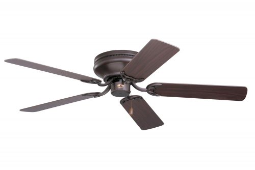 As the name suggests, this CF804SORB Snugger 42-inch indoor ceiling fan by Emerson mounts with a snug, close fit to the ceiling--just 7-2/7 inches from the ceiling, in fact. The unit's oil-rubbed-bronze finish beautifully complements contemporary and classic decor alike, with smooth curves and detailed blade hardware contributing to its unpretentious sense of luxury. The fan's five reversible blades--pitched at 12-degree angles for optimal air movement--sport a dark cherry finish on one side and a medium-oak finish on the other, offering a simple way to customize the unit to existing trim, cabinets, furnishings, and other wood fixtures and accents. For added versatility, the ceiling fan is light-fixture and wall-control adaptable, and its on/off pull chain makes it easy to select from three speed settings. Designed for low-ceiling applications and easy to install, the ceiling fan measures 42 inches wide by 7-2/7 inches high and carries a limited lifetime motor warranty.
