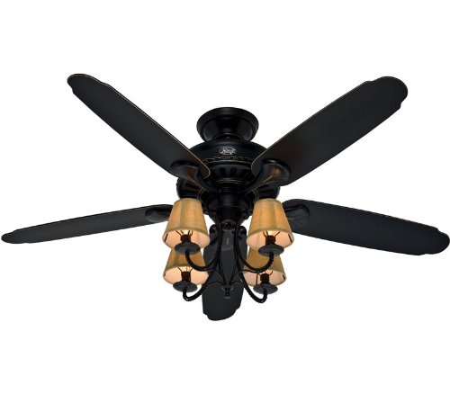 Transform Your Home, and the Way You Feel in it. Comfort, Craftsmanship and Style. No Other Ceiling Fan Comes Close to Hunter. Hunter Combines 19th Century Craftsmanship with 21st Century Design and Technology to Create Ceiling Fans of Unmatched Quality, Style, and Whisper-Quiet Performance. Using the Finest Materials to Create Stylish Designs, Hunter Ceiling Fans Work Beautifully in Today's Homes and Can Save up to 47% on Cooling Costs! Hunter Fan Cortland 227 WhisperWind Motor AVT Hanging System Installer's Choice 3 Position Mounting System 160-Watt Four Light Fixture with Decorative Shades Use Four 40W Candelabra Bulbs (Included) Can Be Installed without Light Kit Limited Lifetime Warranty Suggested Room Size: Large Room Width of Body: 12.1 Number of Blades: 5 Canopy Width: 7.5 Energy Information Airflow: 5934 cfm Electricity Use: 80W Airflow Efficiency: 74 cfm/W Basque Black with Brushed Gold Accents Cortland Indoor CFM: 5934 RPM: 208 Watts: 80 Amps: 0.67 2.5 Inch Downrod(s) Included - 5 Blades Aged Ebony 54 Inches 12 Degree Pitch Fan Clearance: 13 Blade Clearance: 11.9 Light Clearance: 22.5 Mounting Height: 3.6 Mounting Width: 7.54 Motor Width: 12.1 Light Fixture Included