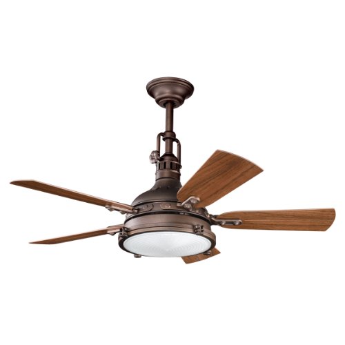 The Kichler 310101WCP Hatteras Bay 44 in. Indoor/Outdoor Ceiling Fan - Weathered Copper brings breezy style (plus plenty of breeze) to any space, indoors or out. Five 44-inch blades are finished in a light walnut that adds a little warmth to the nautical-inspired weathered copper finish. Plus, you're in total control of the three speed settings thanks to the included remote. Like the shade? So do we. It's a fresnal glass lens and comes complete with four 40-watt T3 bulbs. The fan is UL-rated for damp locations and includes a light kit and 78 inches of supply wire.Kichler QualitySince 1938, Cleveland-based Kichler Lighting has been known for their innovative designs and excellent craftsmanship. Kichler is the world's leading decorative lighting fixture company and the winner of four ARTS Lighting Manufacturer of the Year awards. Kichler designers travel the world to discover the latest trends in exterior and interior style, colors, and designs. They then translate the best of those trends into fixtures that will bring beauty, pleasure, and light into your home. Kichler fixtures stand the test of time and are functional works of art that you're sure to treasure.