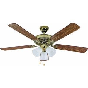 - 52-Inch Vintage ceiling fan with a polished brass finish and five walnut / oak reversible blades